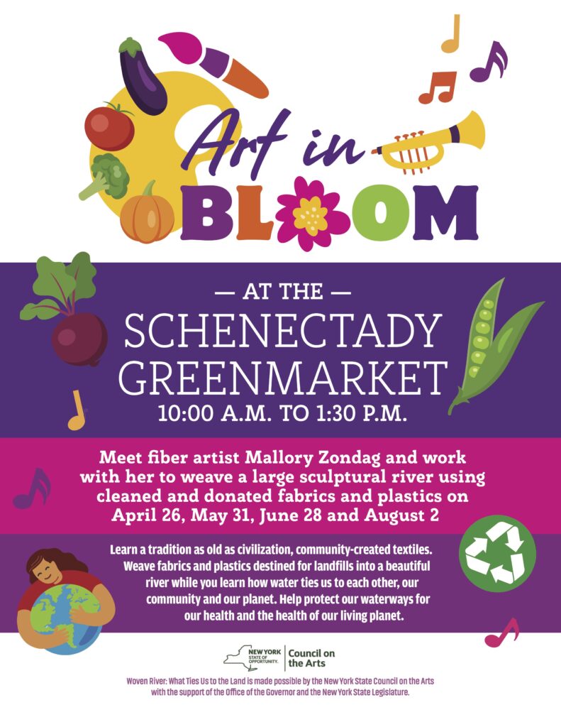 Thanks to funding from the New York State Council on the Arts since 2023, Art in Bloom brings a different art or musical activity to the Schenectady Greenmarkets at their outdoor location around City Hall from May through October and at special pop-up activities at the Greenmarket’s indoor location inside Proctors.